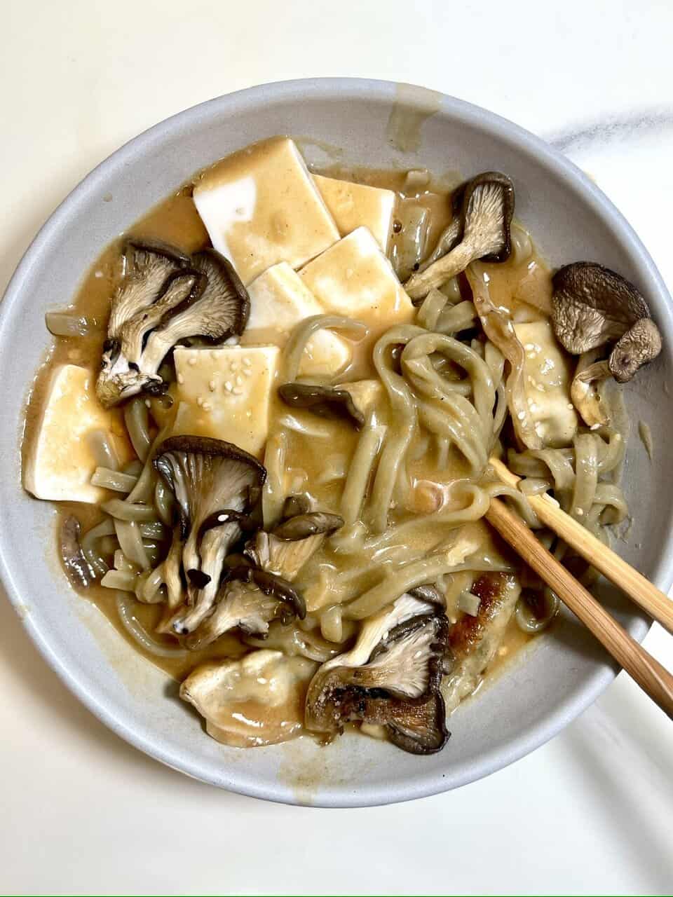 It’s a fusion-style noodle soup that combines Thai red curry, coconut richness, king oyster mushroom “scallops”, and silky tofu for the ultimate comforting weeknight dinner. Shout out to KING MUSHROOM FARM for sending me mushrooms.
