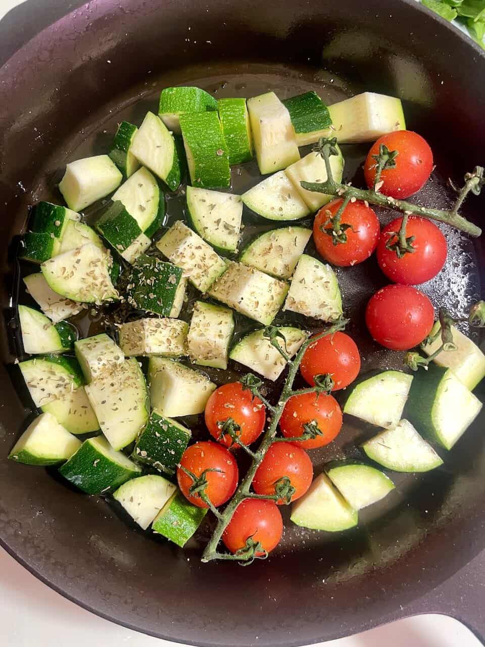 - Cook for 3–4 minutes, letting the tomatoes blister and the zucchini soften slightly. Remove from heat.