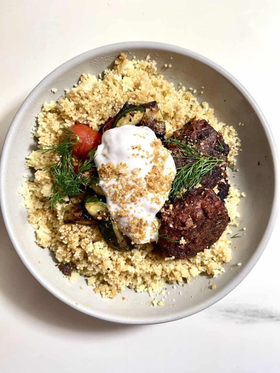 - Fresh-meets-comforting thanks to warm seared veggies and a creamy dressing.