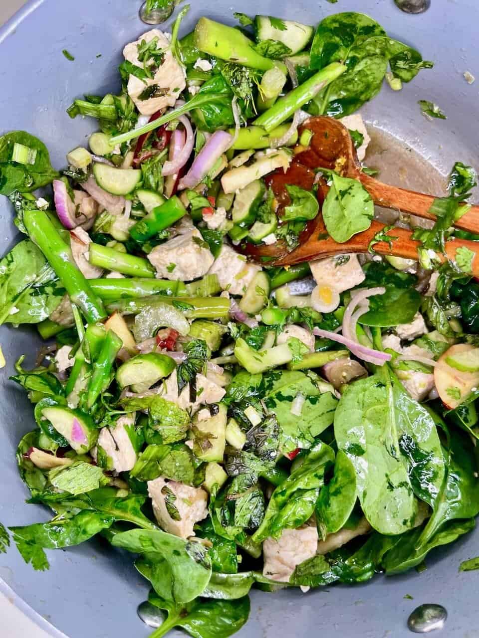 - On a cutting board, slice apples into bite-sized pieces and chop shallots, scallions, and fresh herbs. Add to a mixing bowl with spinach, tofu, and asparagus.