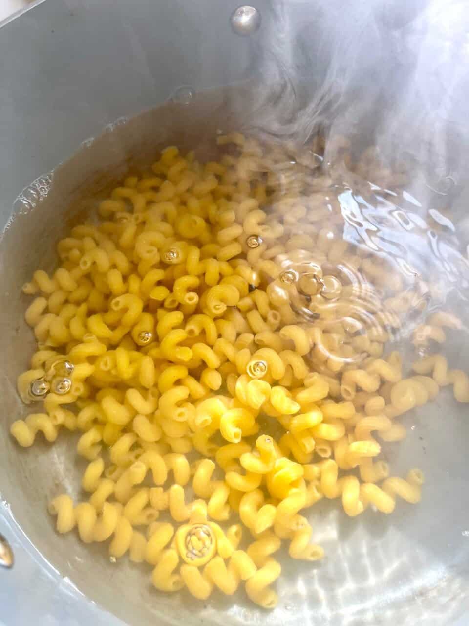 - Bring a large pot of salted water to a boil. Cook Brami curly macaroni according to package instructions until al dente. Reserve 1 cup of pasta water, then drain.