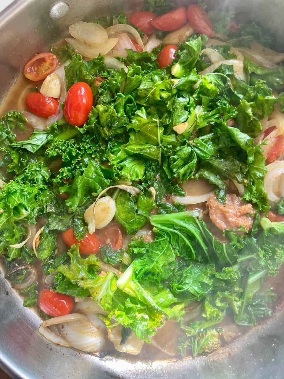 - Stir in the diced tomatoes and cook until softened. Add the chopped kale and sauté until wilted (3–4 minutes).