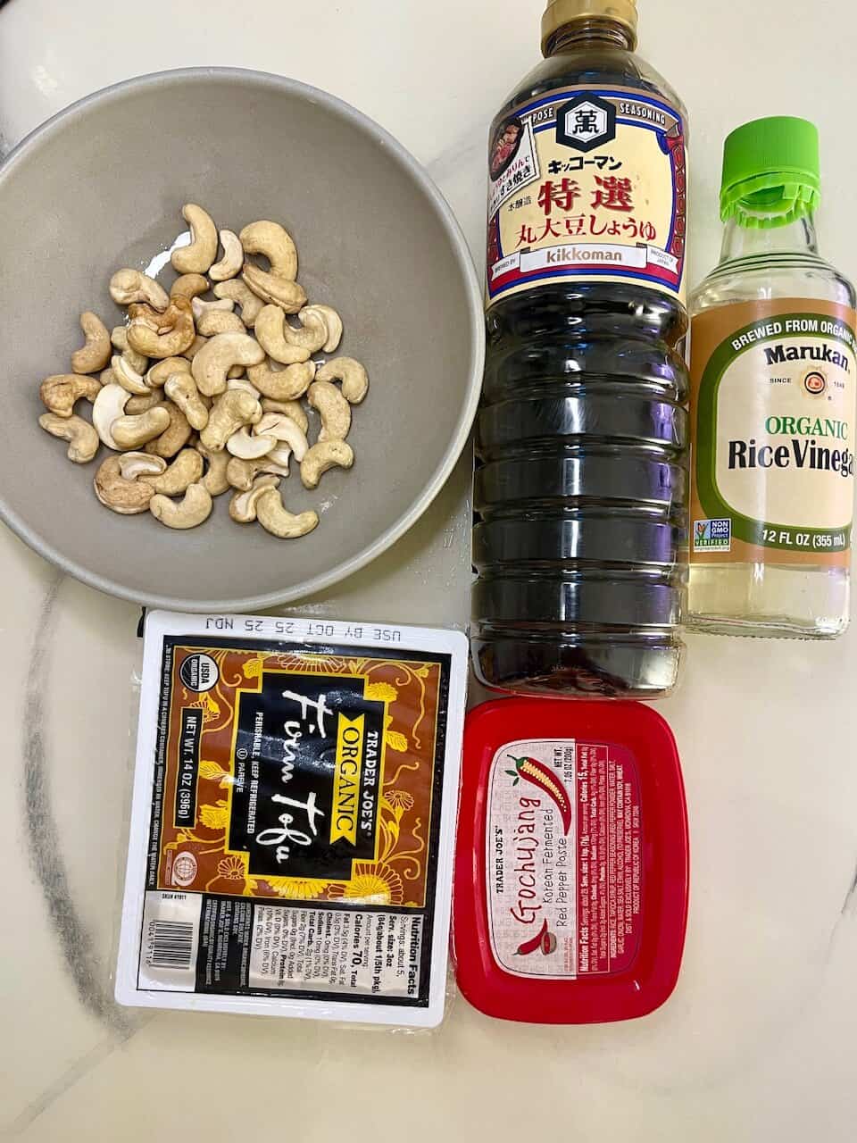 - Make the sauce: Blend soaked cashews with gochujang, soy sauce, vinegar, and water until silky smooth. Adjust seasoning to taste.