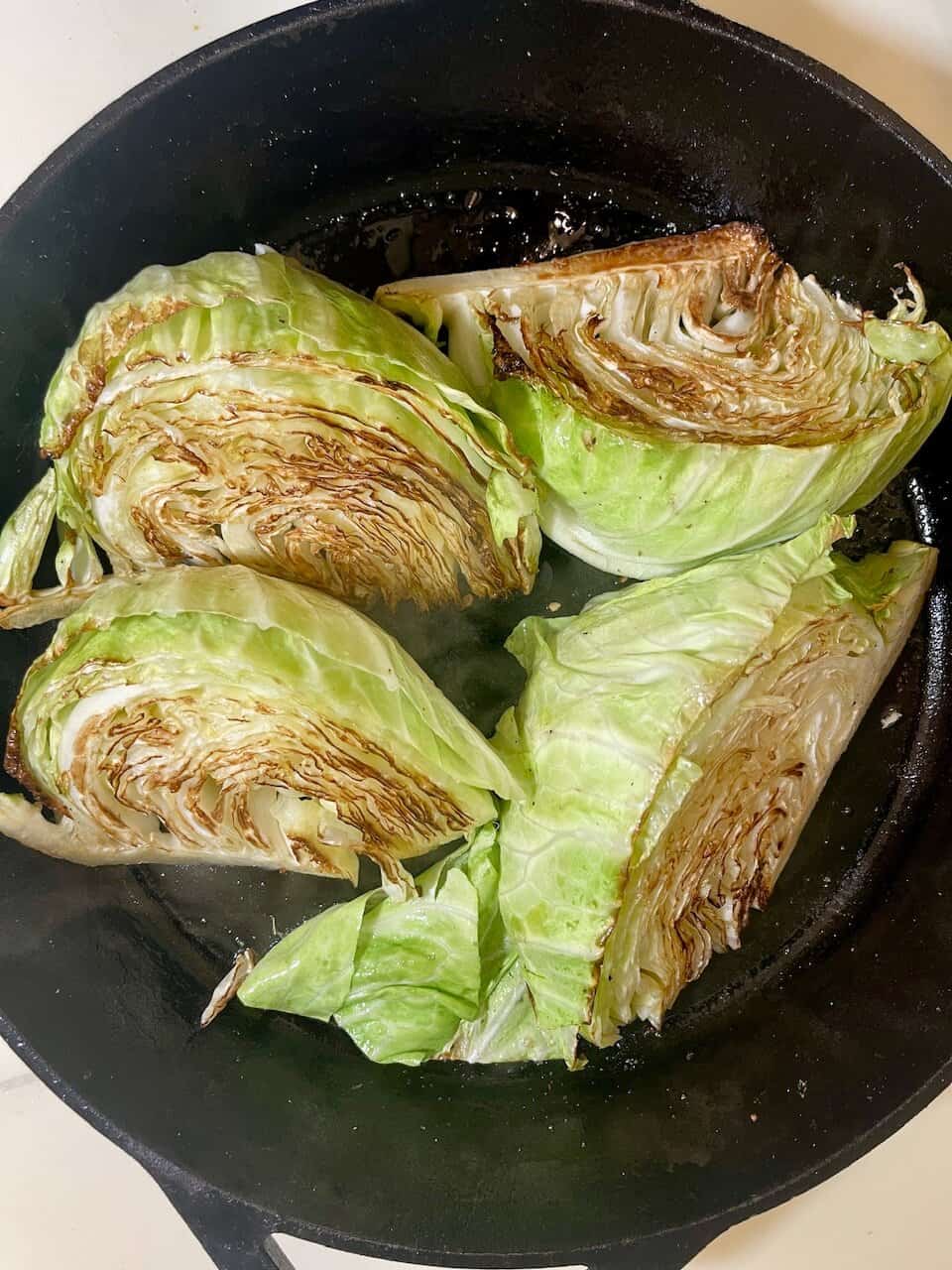 - Preheat the oven to 400°F (200°C). Heat 1 tablespoon olive oil in a large oven-safe skillet over medium-high heat. Add the cabbage wedges in a single layer and season with salt and pepper. Sear for 3–4 minutes per side, until deeply golden and caramelized. Transfer the cabbage to a plate and set aside.