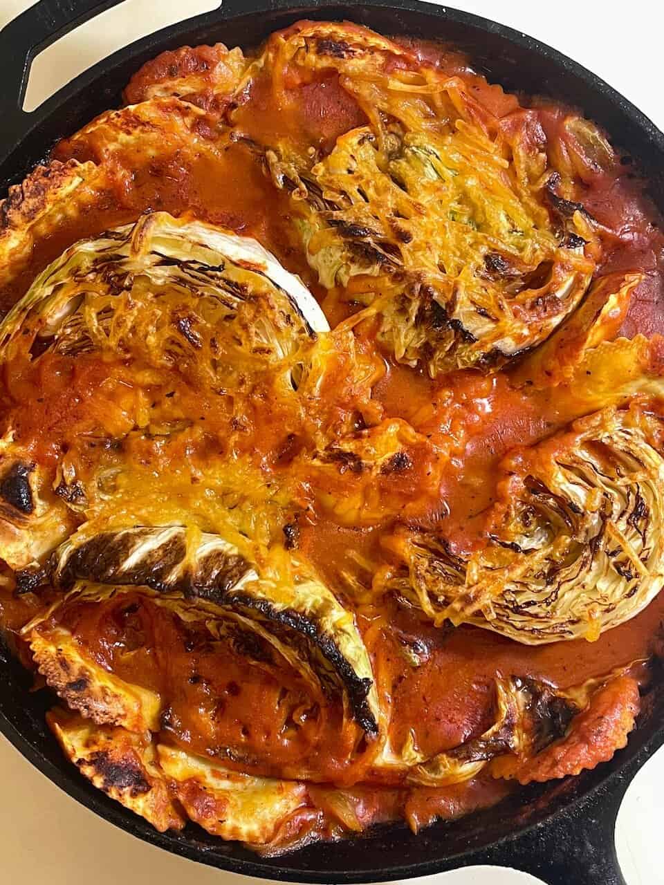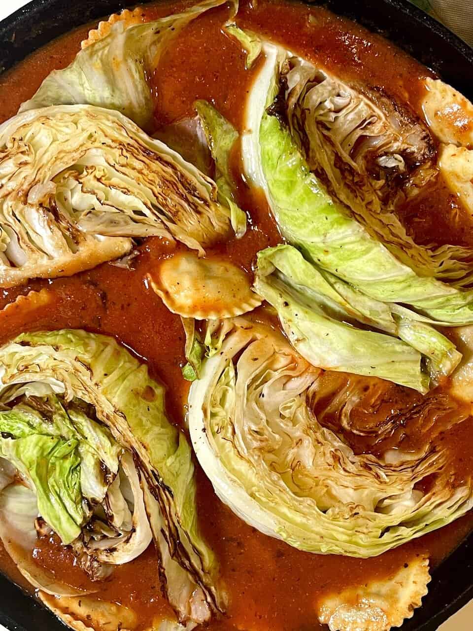 - Nestle the seared cabbage wedges back into the skillet on top of the ravioli and sauce. Sprinkle evenly with vegan cheese.