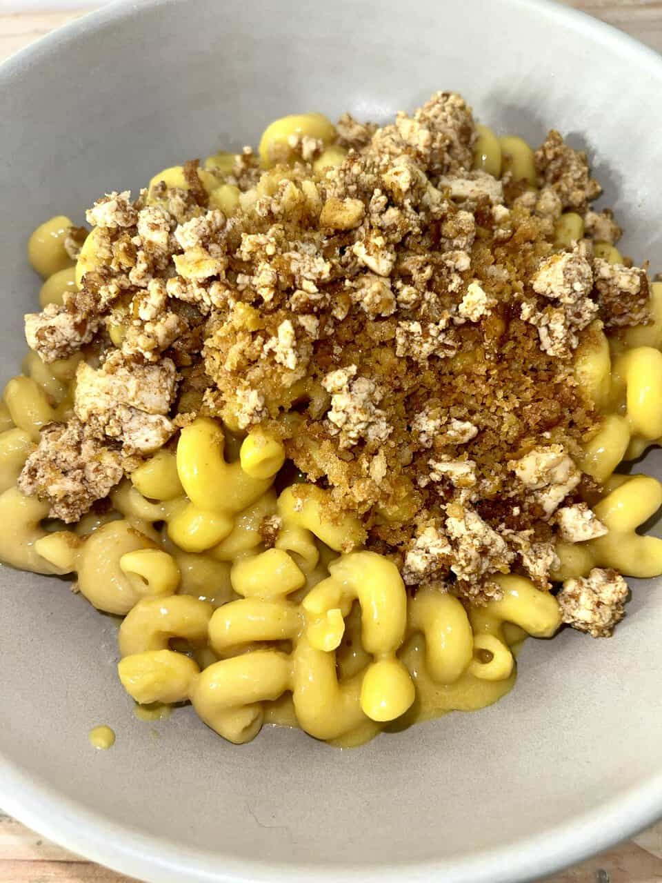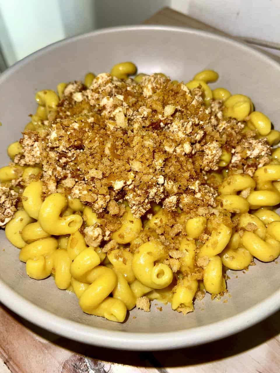 Spoon your creamy chickpea tofu mac and cheese into bowls or a casserole dish. Top generously with paprika tofu crumbs and panko nutritional yeast crunch.