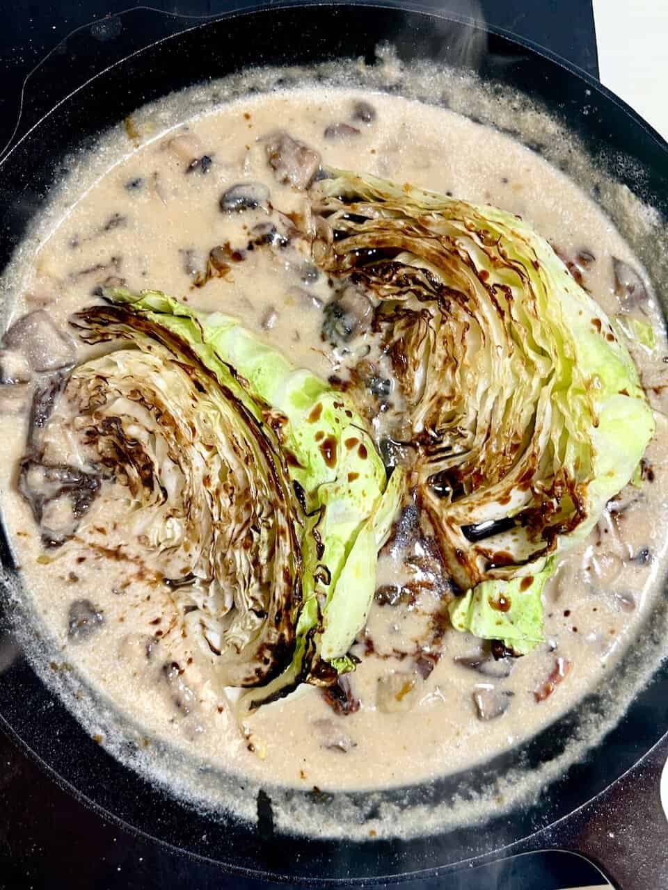 - Return the seared cabbage wedges to the skillet after the sauce thickens, or plate them individually and spoon the creamy mushroom sauce over the top.