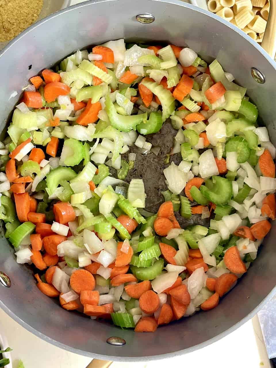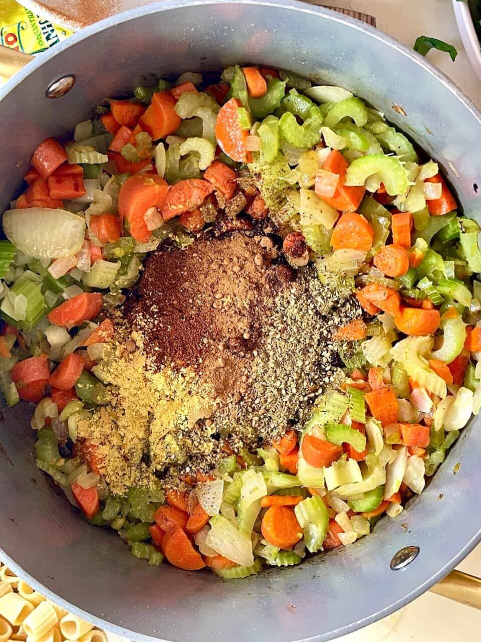 - Heat olive oil in a large soup pot over medium heat. Add onion, carrots, and celery. Sauté for about 5 minutes until softened. Stir in minced garlic and cook for another minute until fragrant.