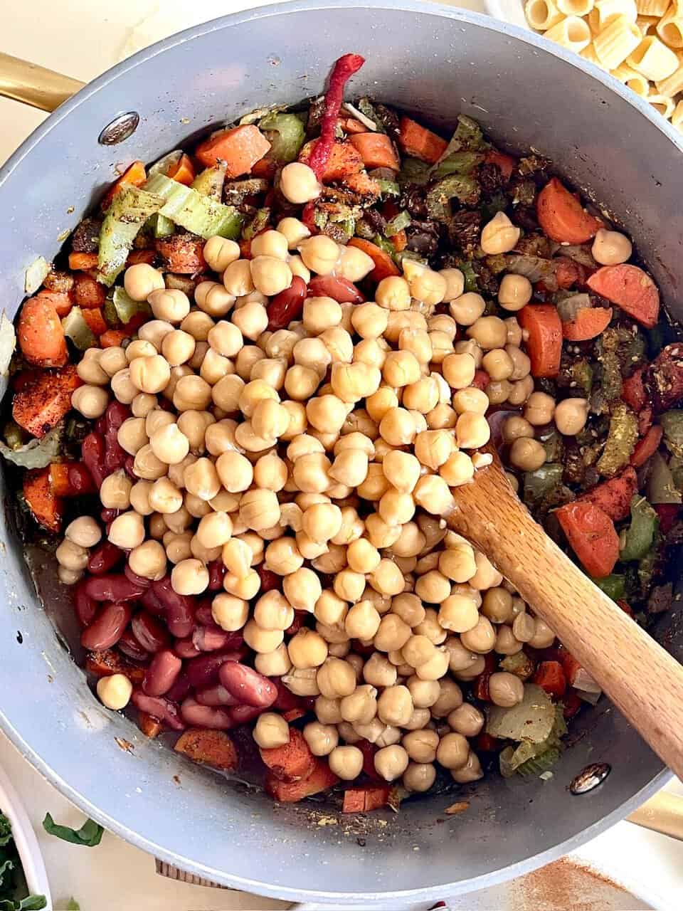 - Add chickpeas, white beans, kidney beans, diced tomatoes, broth, and the bay leaf. Stir well, bring to a boil, then reduce to a gentle simmer for 20 minutes to let the flavors meld.