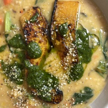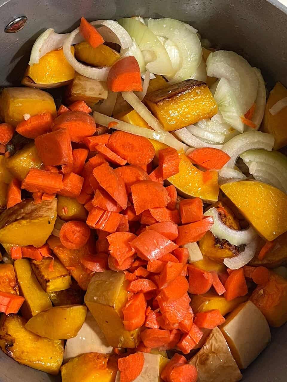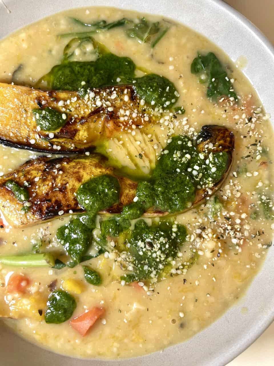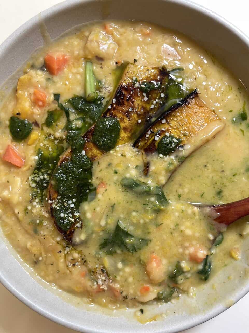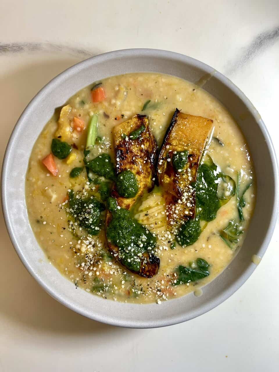 The addition of miso and soy sauce adds umami depth, while garlic, onion, carrots, and leafy greens balance the sweetness of the squash. Vegan cheddar melts into the broth, creating a subtle creamy finish without overpowering the vegetables.