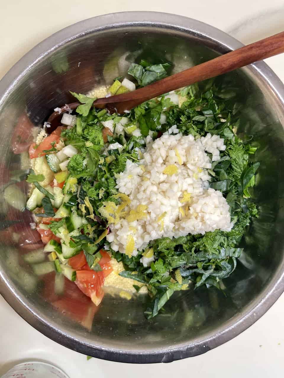 - In a large bowl, combine the couscous with all vegetables and greens.