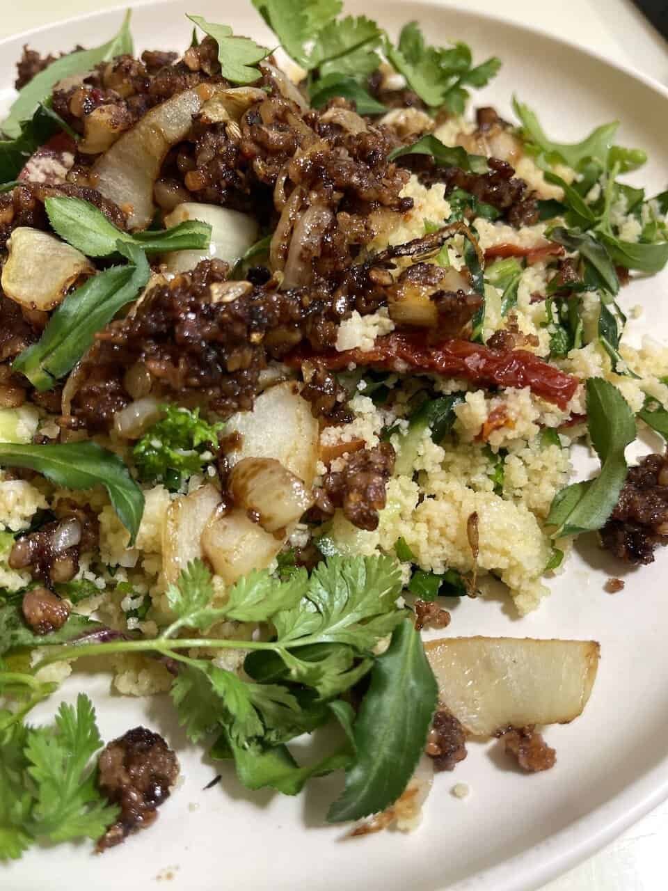 - Spoon the savory vegan crumble mixture over the couscous salad. Serve warm or at room temperature.
