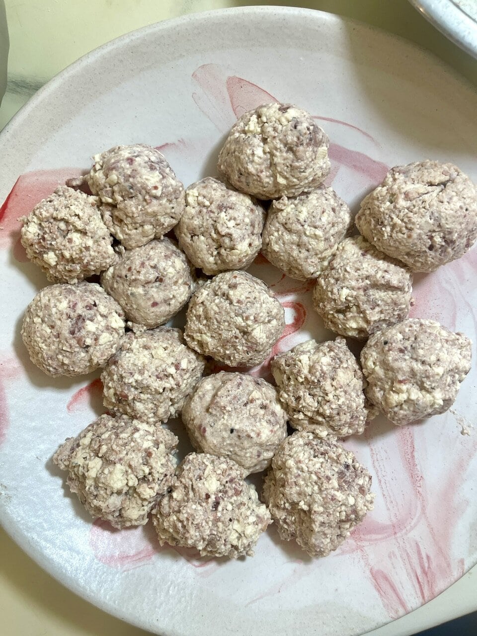 - Shape the mixture into small balls — firm enough to hold together but not packed too tightly.