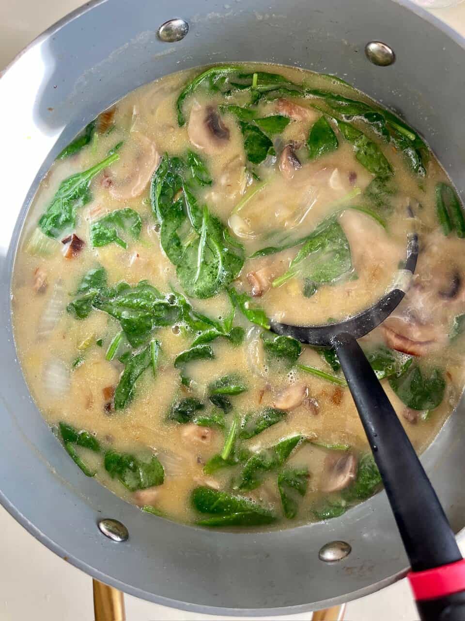- Stir in baby spinach until wilted. Garnish with a sprinkle of herbs before serving.