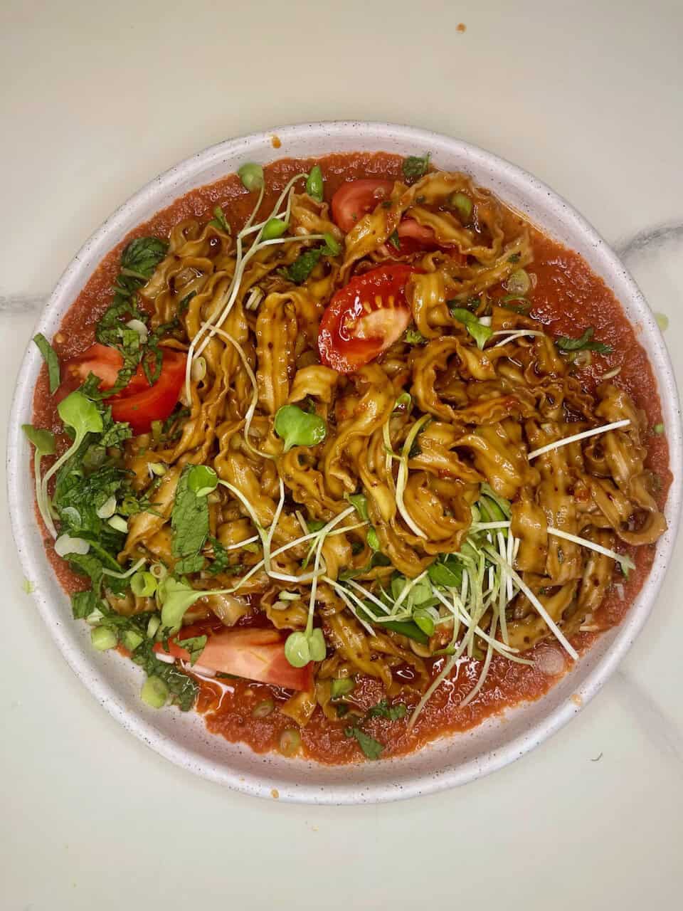 - Thick or thin: Adjust thickness by adding fresh vegetable juice or reserved noodle water.
