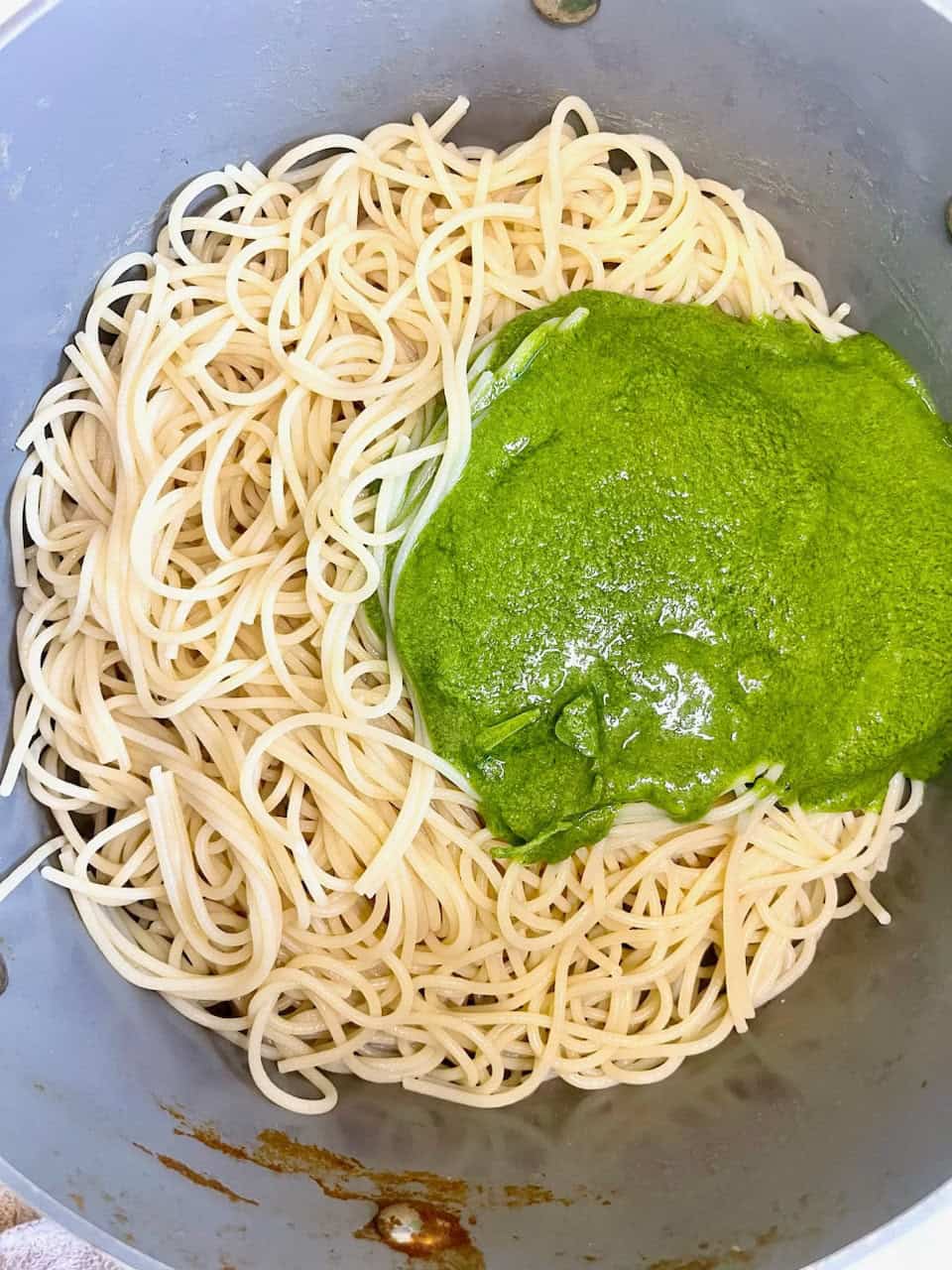 - Toss cooked spaghetti with pesto in a large pan or bowl.