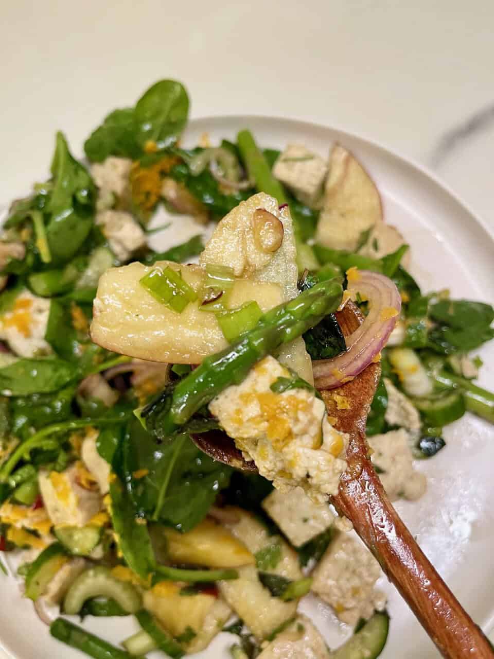 - In a large bowl, combine the blanched tofu, asparagus, apple slices, cucumber, celery, and scallions.