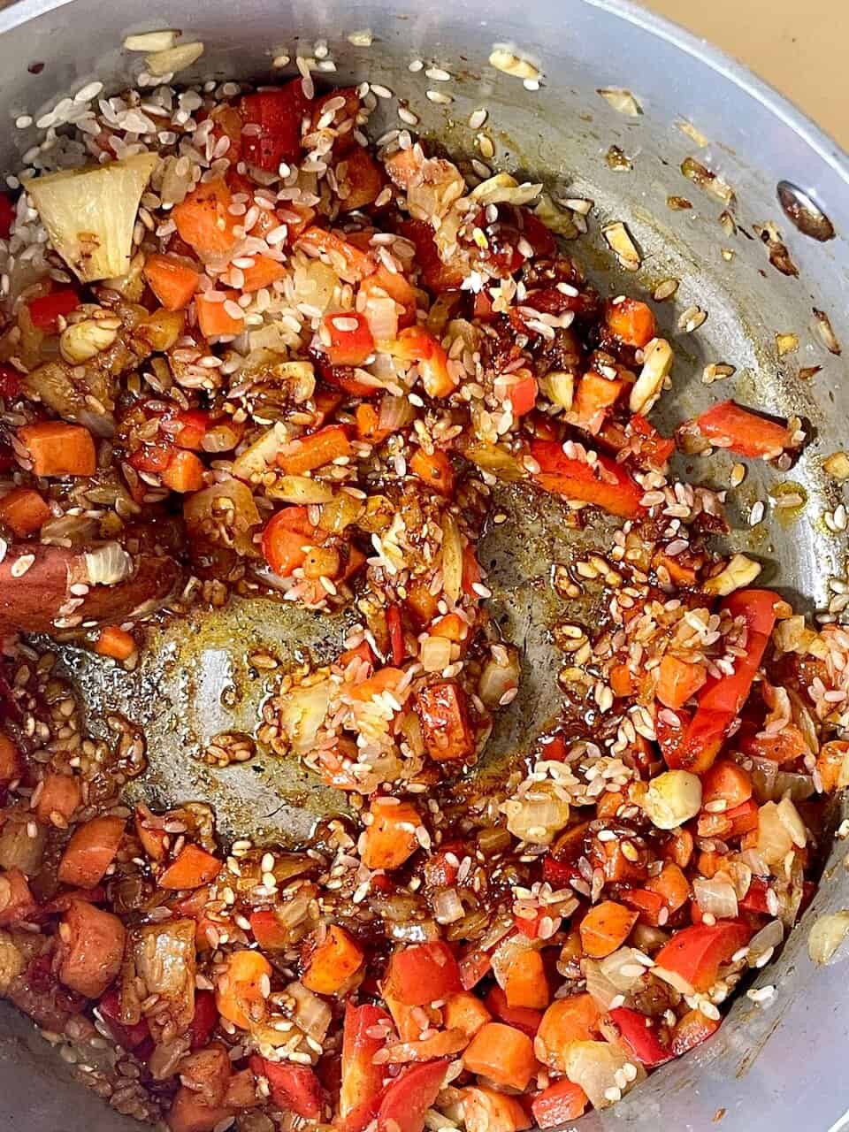 Rinse the 15-bean mix under cold water and remove any debris. - Sauté the aromatics