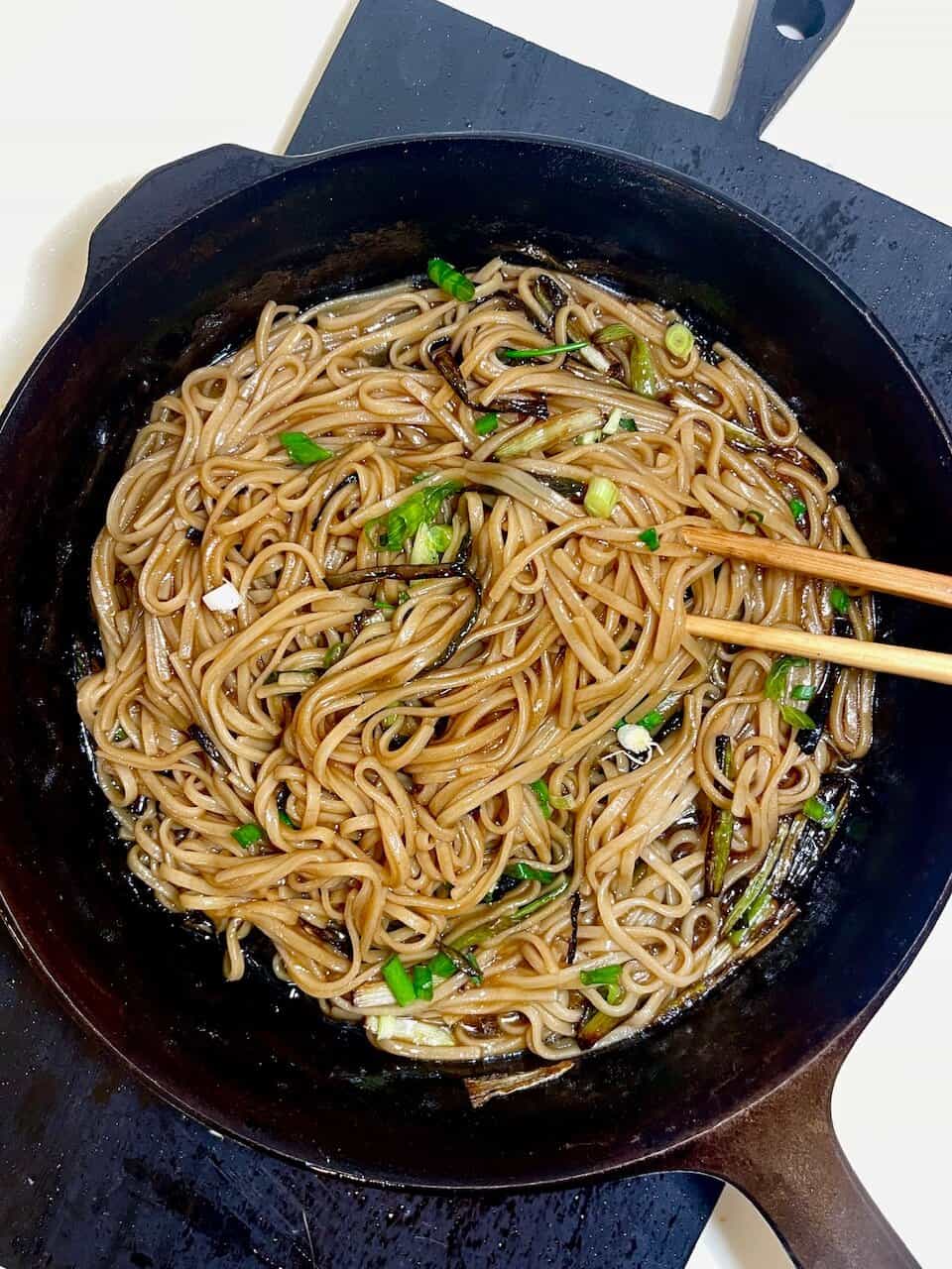 - Add the cooked noodles directly to the pan. Toss until evenly coated in the scallion oil sauce and glossy.