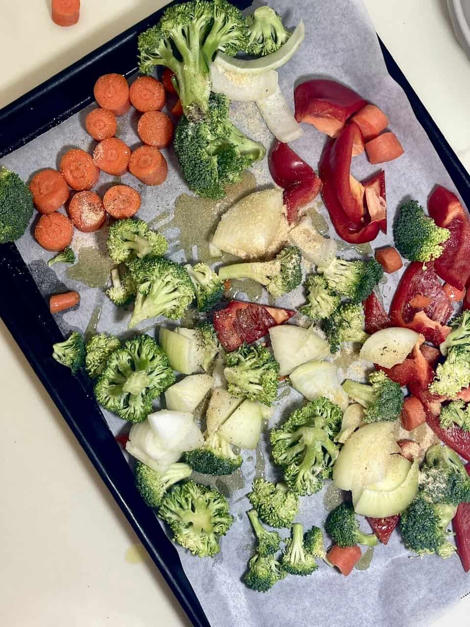 Toss broccoli, carrots, bell pepper, and onion with olive oil and seasonings. Roast until caramelized and tender.