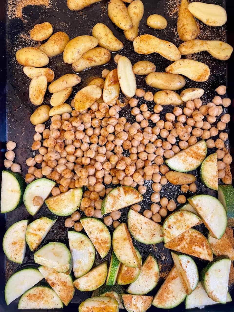 - Prep the veggies: Toss zucchini, potatoes (or sweet potatoes), and chickpeas with olive oil or avocado oil, plus your favorite seasonings. Spread in an even layer.