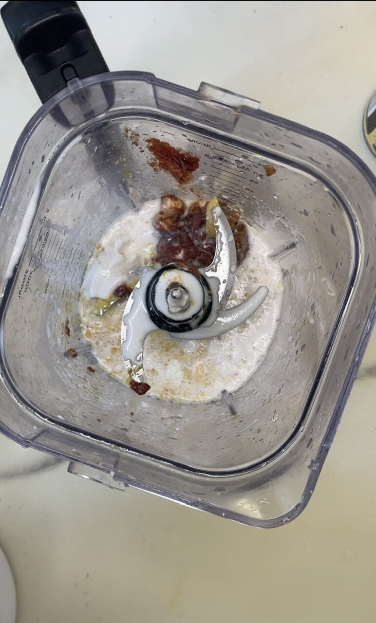 - Make the miso coconut sauce: Blend cashews, coconut milk, miso paste, tomato paste, Better Than Bouillon, nutritional yeast, and a pinch of chili flakes until smooth and creamy.