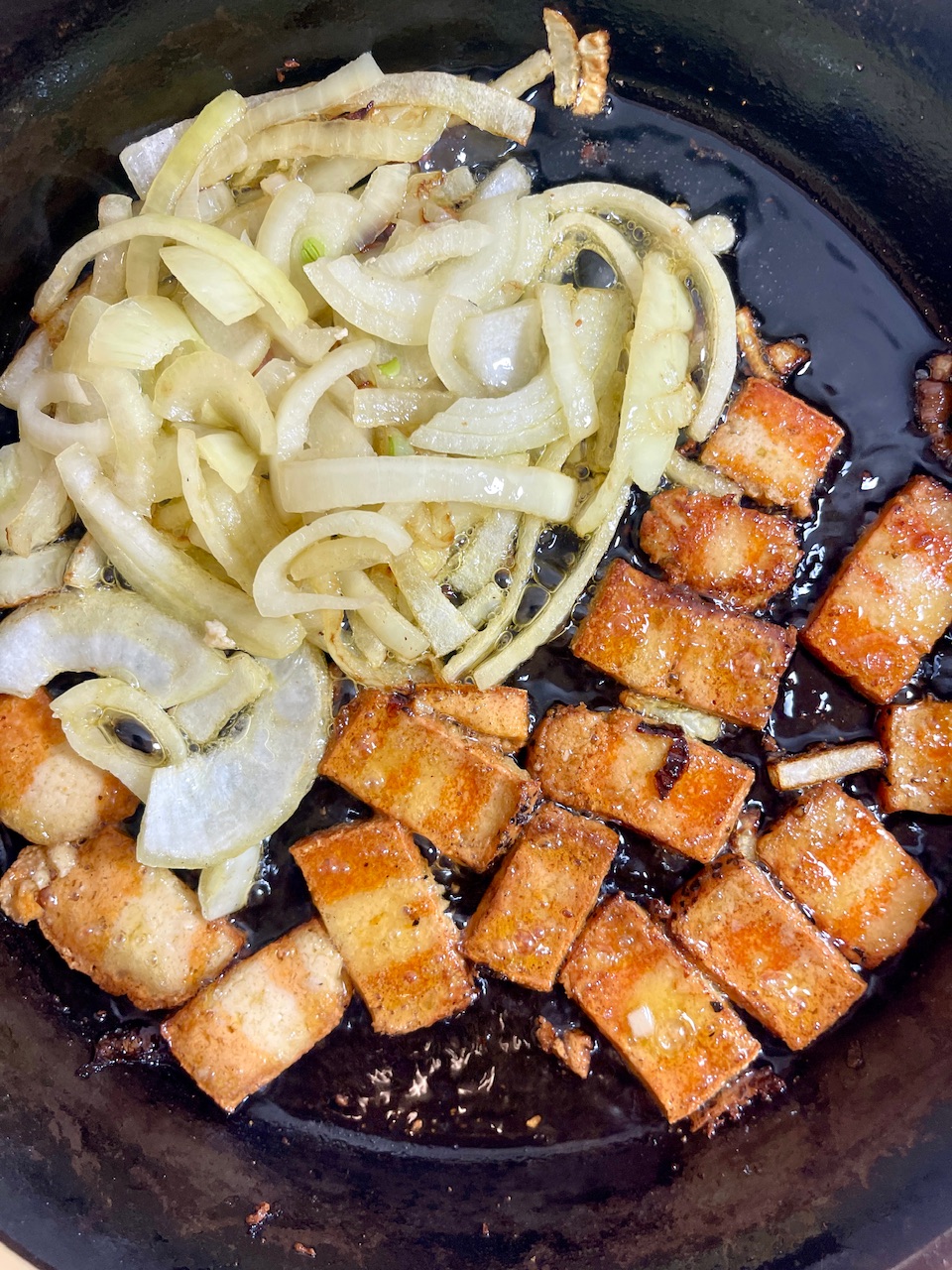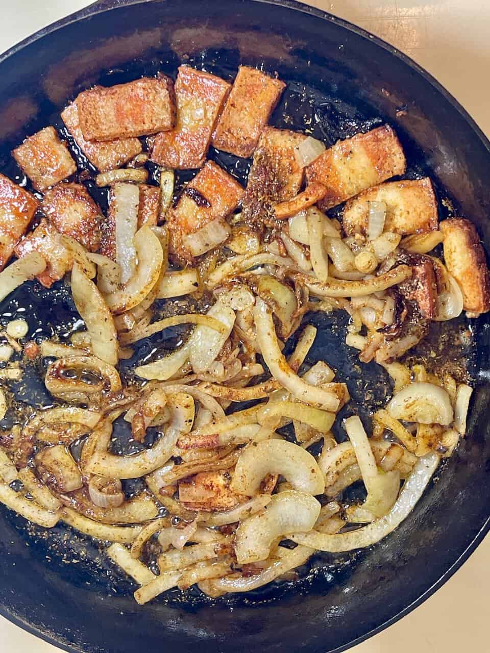 - Toss in the chopped Thrilling Foods vegan bacon. Let it crisp slightly and infuse the aromatics with a rich, smoky depth—this is the plant-based answer to bacon grease and ham hocks.