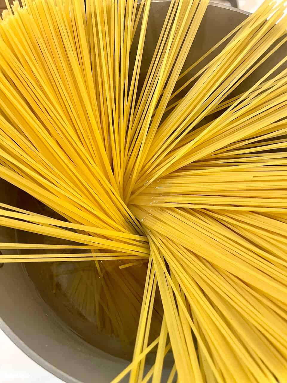 Spaghetti, rigatoni, and penne are all excellent, but feel free to use your favorite.