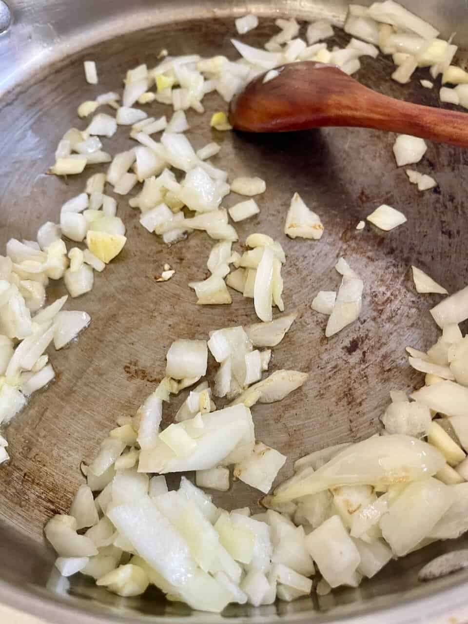 - Heat olive oil in a large pan over medium heat. Add the chopped onion and cook until soft and translucent, about 5–7 minutes. Stir in the garlic and cook for another 1–2 minutes until fragrant.