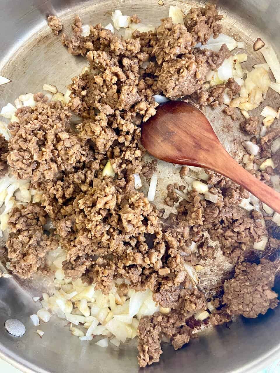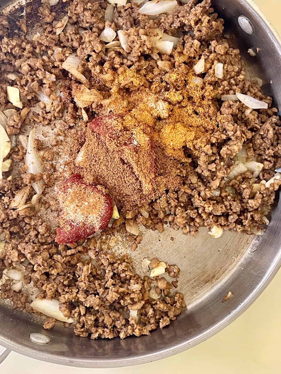 - Add Trader Joe’s Beefless Ground to the pan. Break it up with a spoon and cook for 4–5 minutes until heated through and lightly browned.