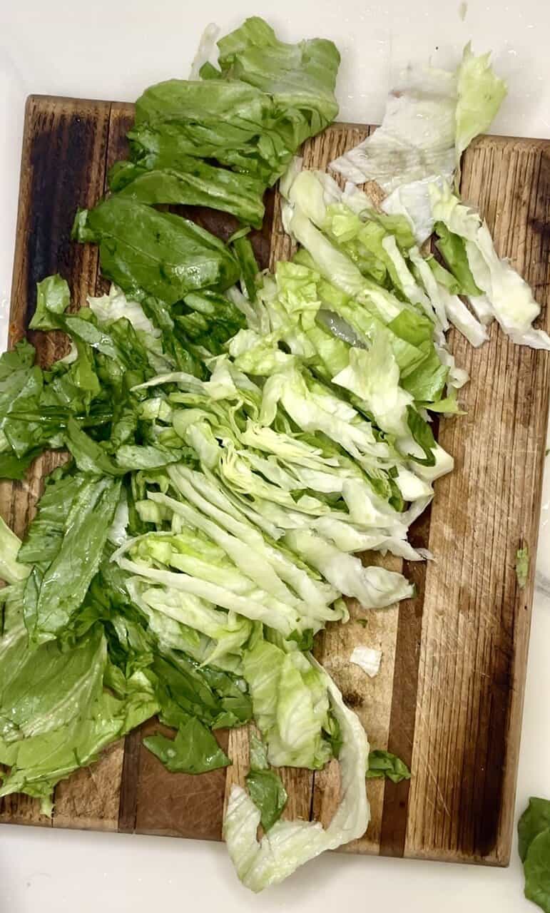 - Chop iceberg lettuce into bite-sized pieces. Slice pickles and get your herbs (dill and cilantro) finely chopped. Set aside.