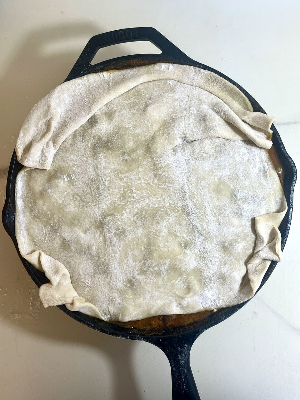 - Lay puff pastry over the top, trimming excess