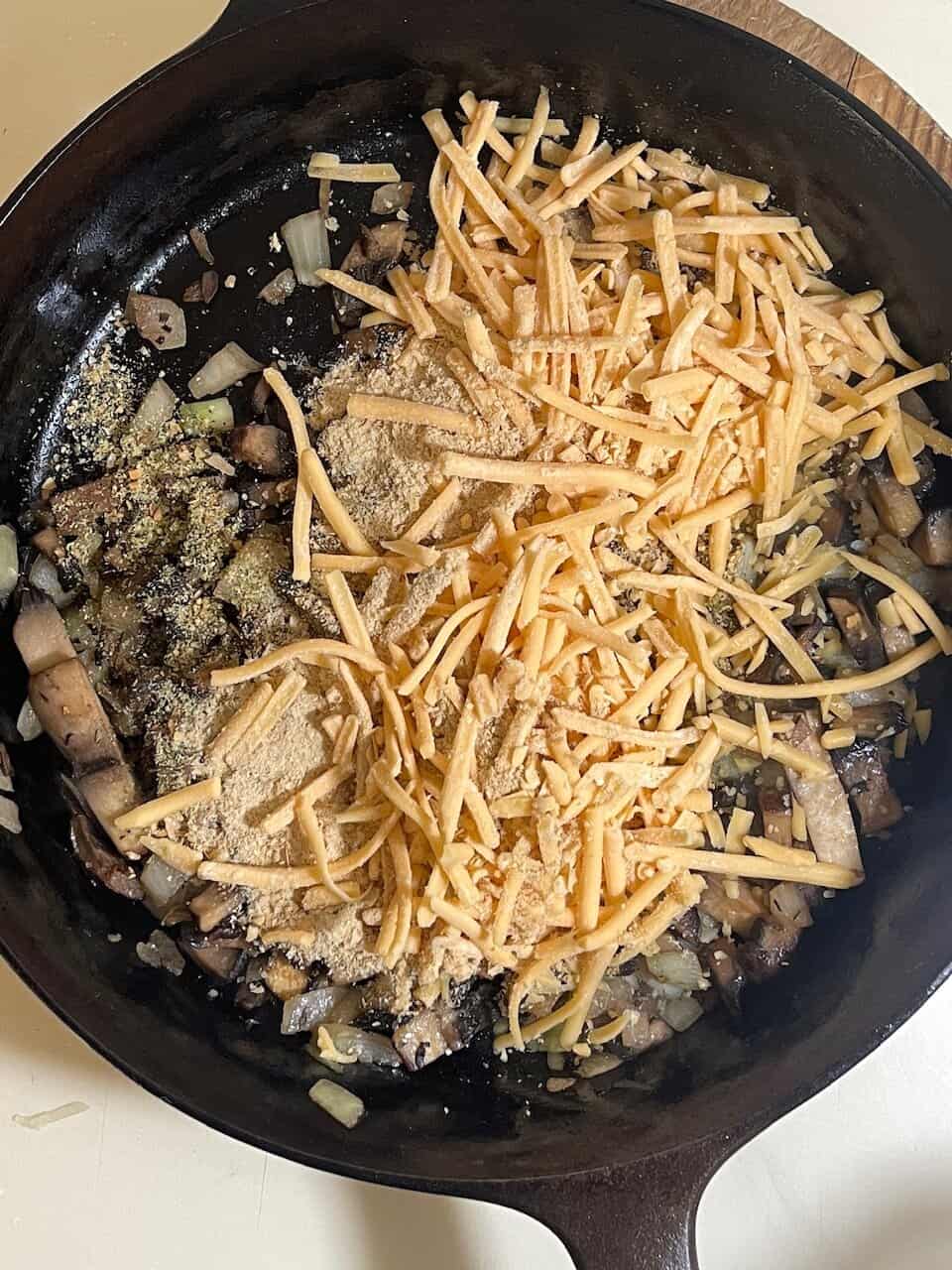 Nutritional yeast adds savory depth, while vegan cheese provides richness and melt.