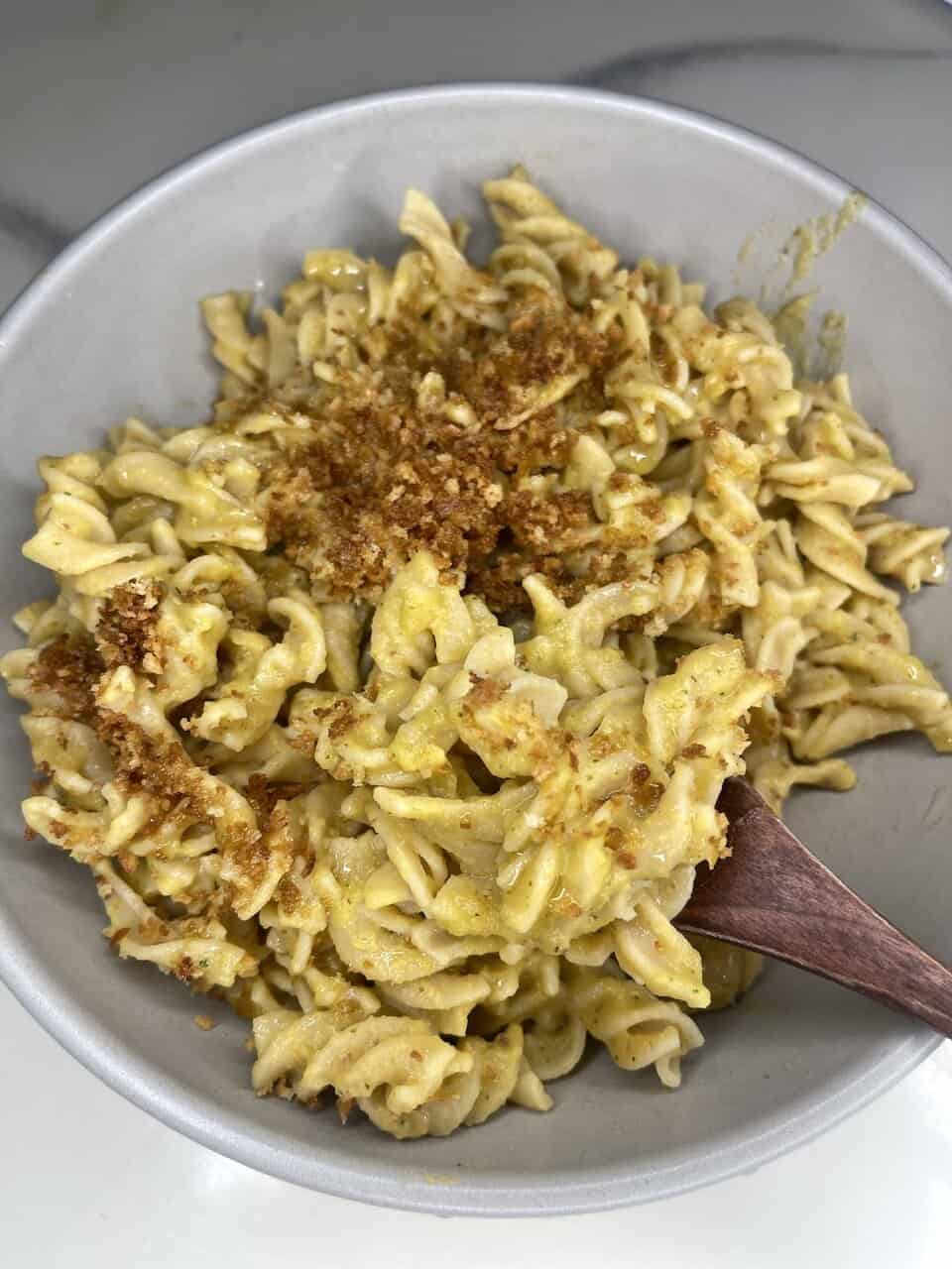 - Top with a sprinkle of nutritional yeast and toasted panko bread crumbs and serve warm.