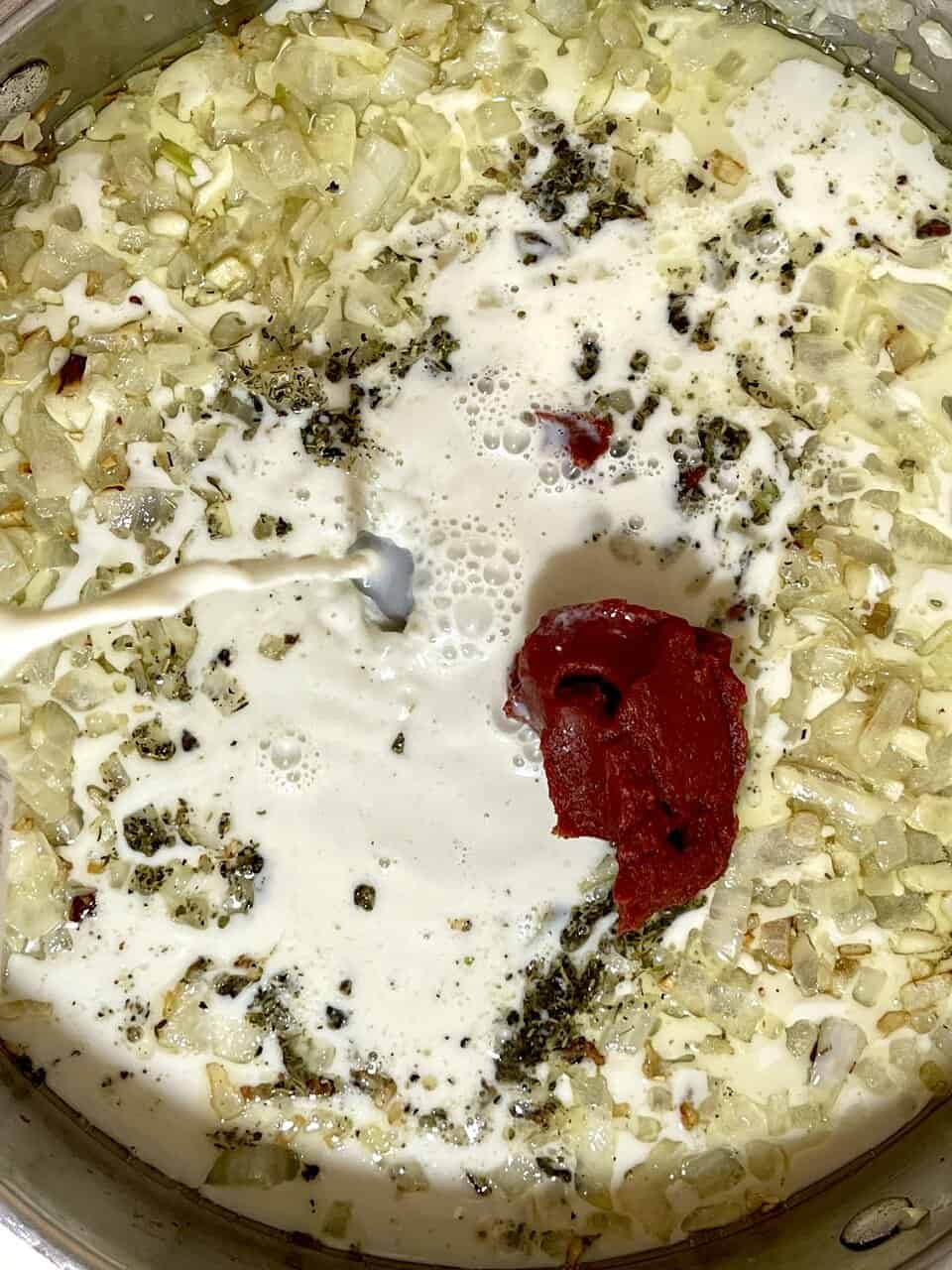 - Add tomato paste and cook 1–2 minutes to deepen flavor. Stir in Italian seasoning, red pepper flakes, and sun-dried tomatoes. Pour in plant milk, scraping up browned bits. Simmer 3–5 minutes until slightly thickened. Season to taste.