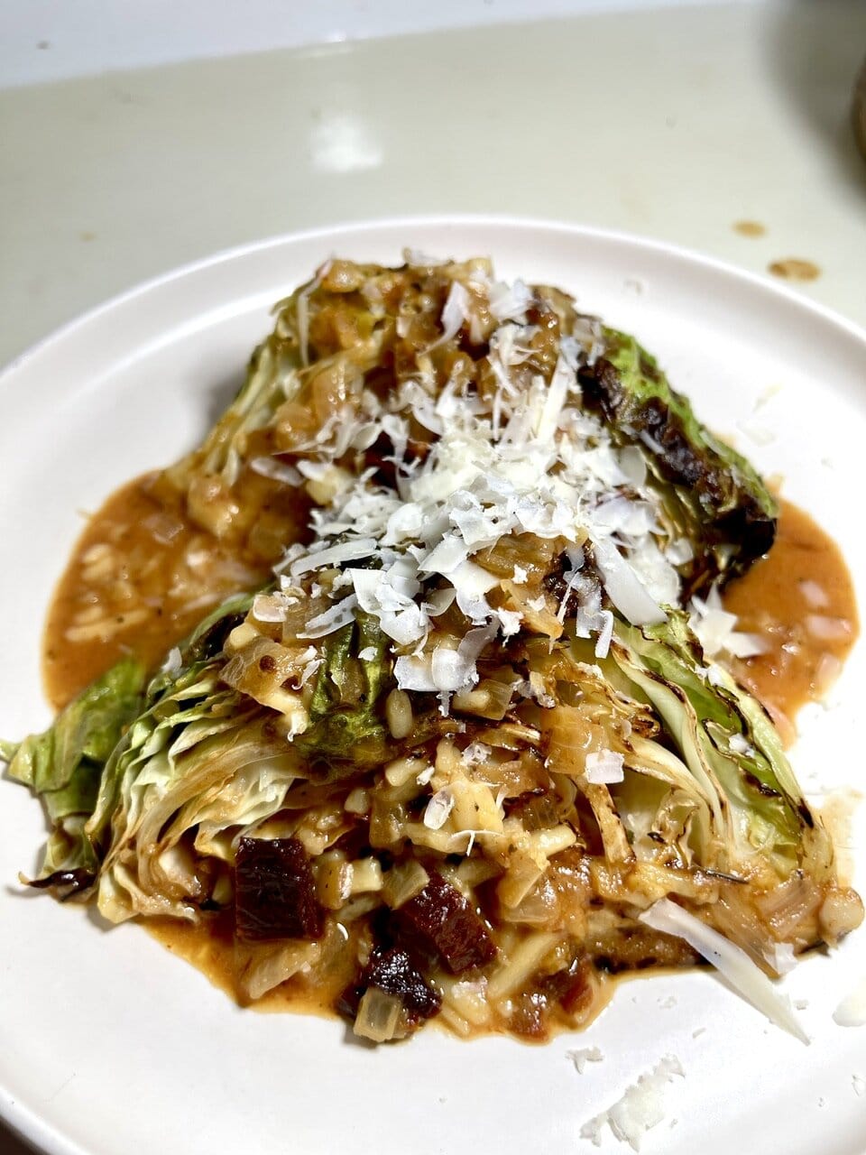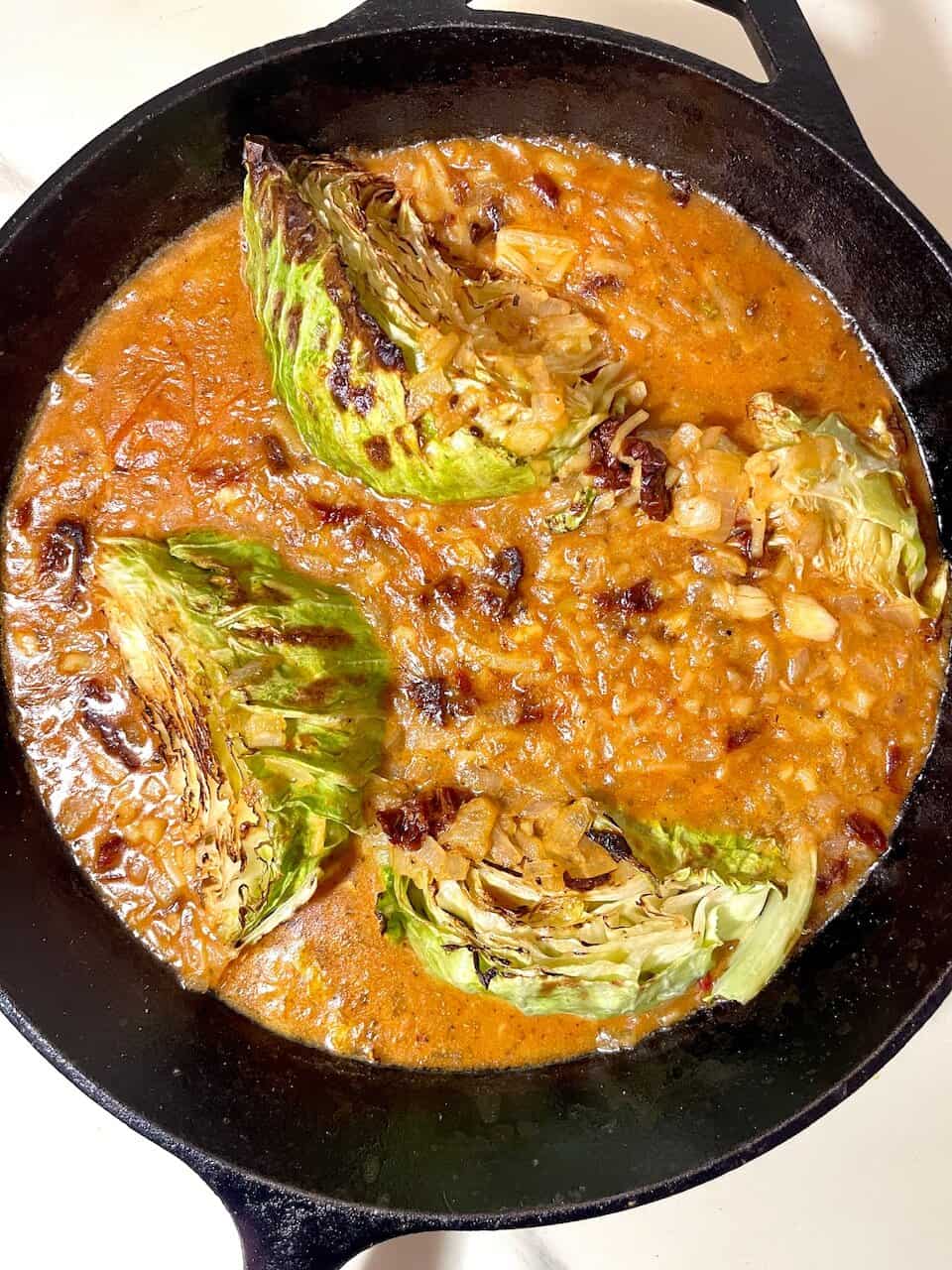 - Nestle seared cabbage wedges back into the skillet. Spoon sauce over each wedge and sprinkle evenly with vegan parmesan.