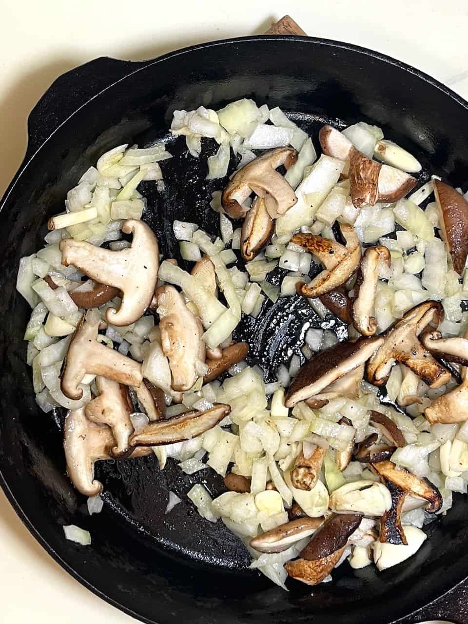 - Add onion and garlic to the mushrooms. Once fragrant, add olive oil and vegan butter, stirring to coat everything evenly.