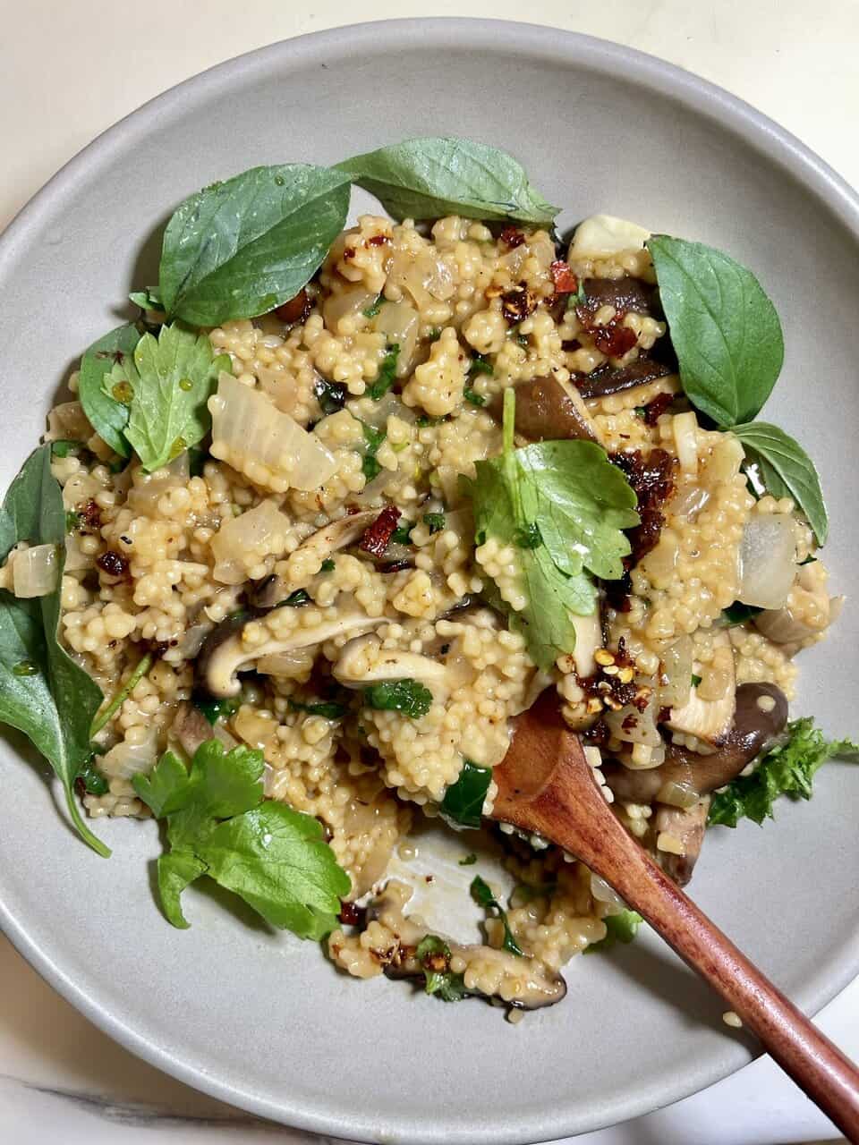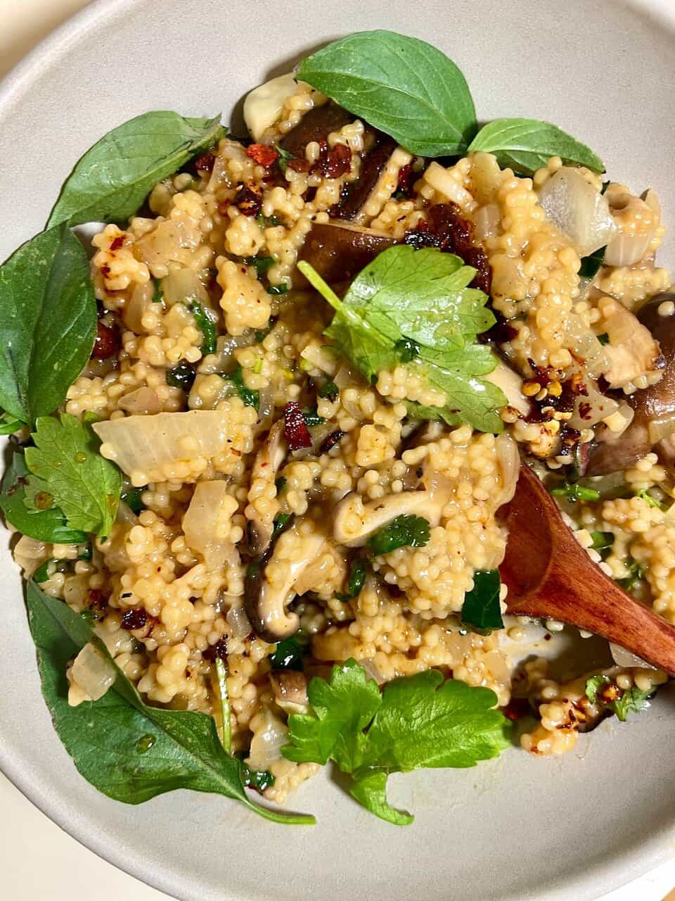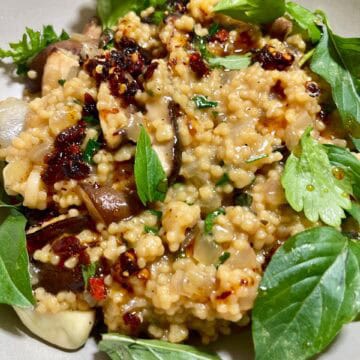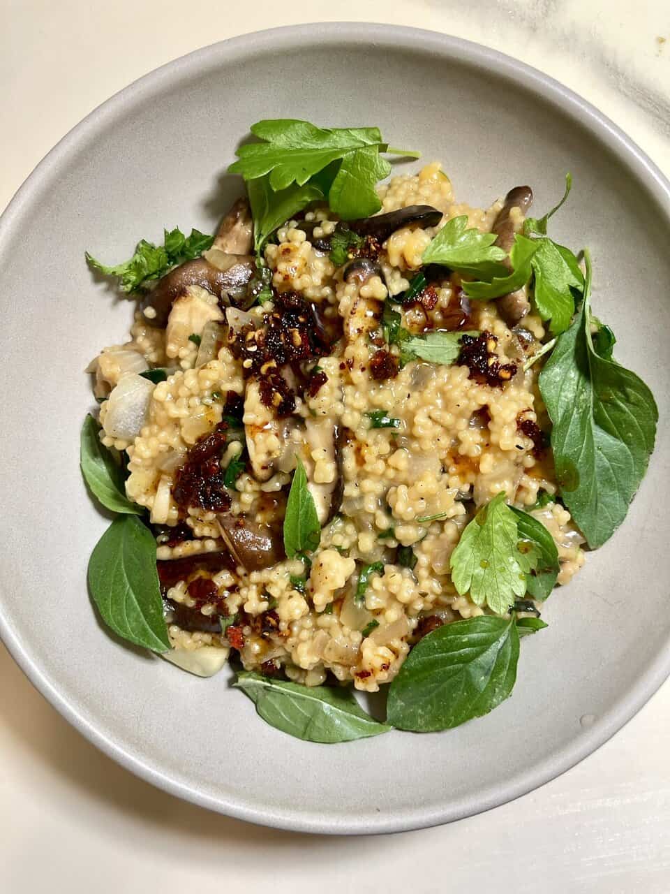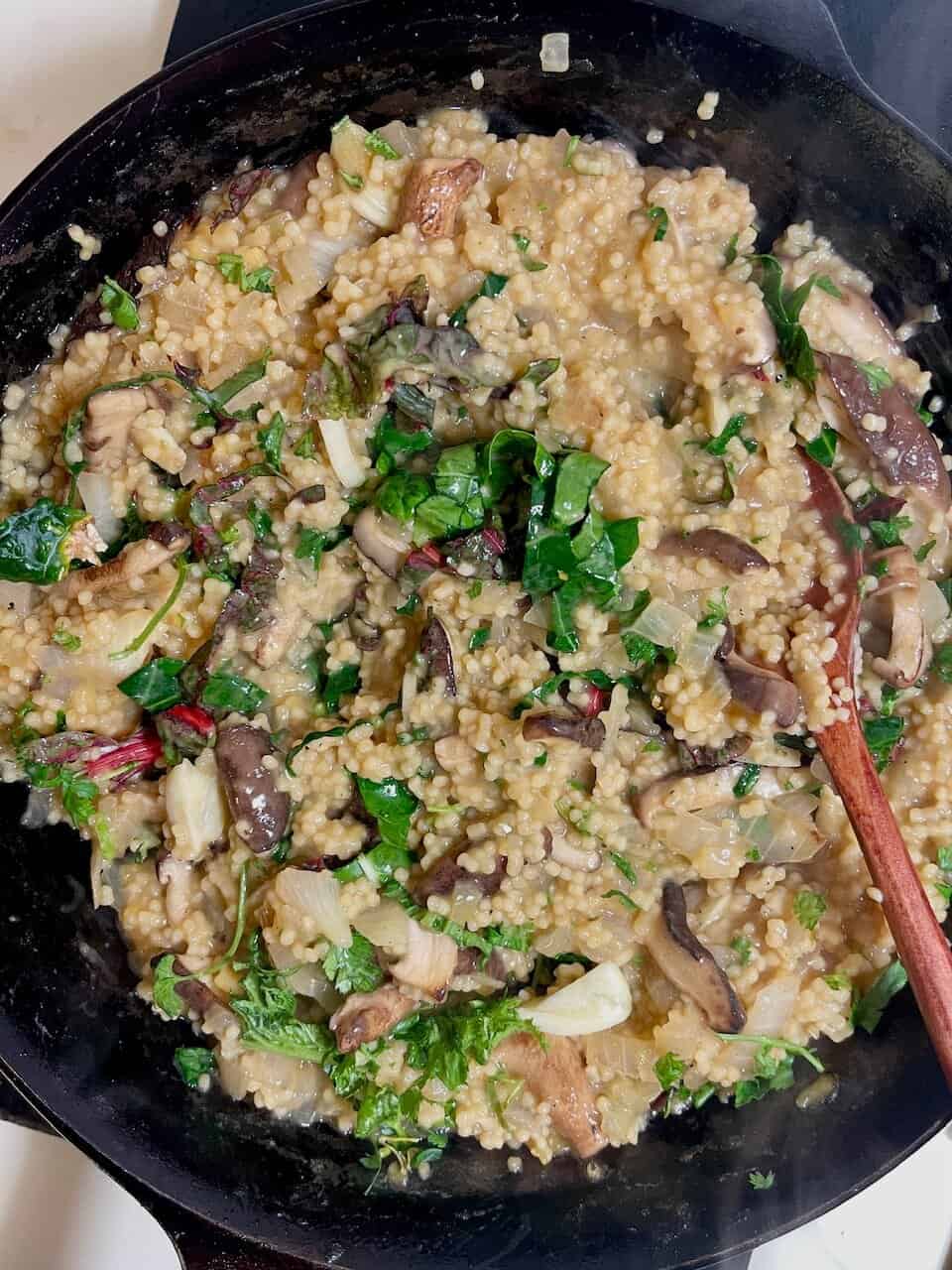 Vegan Pearl Couscous Risotto with Shiitake Mushrooms (Cheesy & Cozy)