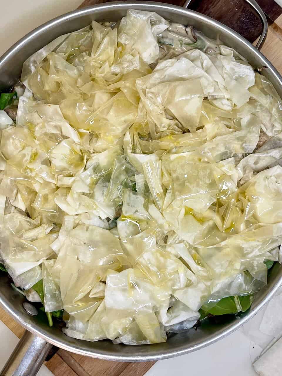Transfer the mixture into a baking dish. Lay a sheet of phyllo dough over the top, brush with olive oil, and repeat. For the final layer, crumple the phyllo sheets slightly to create that rustic, pie-top look. Brush generously with oil.