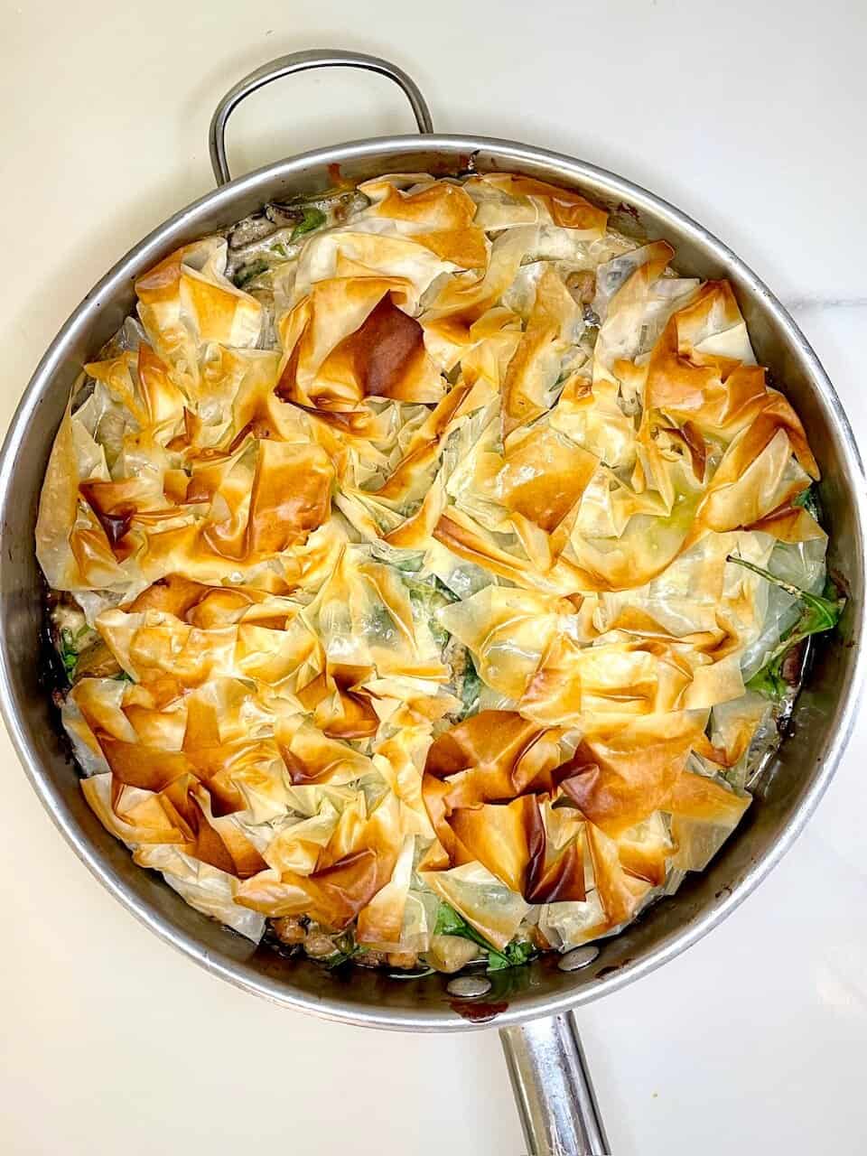 - Top with olive oil–brushed phyllo dough, crumple the final layer for texture, and bake until crisp and golden.