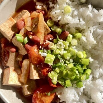 This high protein tofu kidney bean tomato curry is a wholesome, plant-based dinner packed with flavor, fiber, and protein. A quick, comforting vegan curry made with pantry staples like tofu, beans, and tomatoes — perfect for busy weeknights